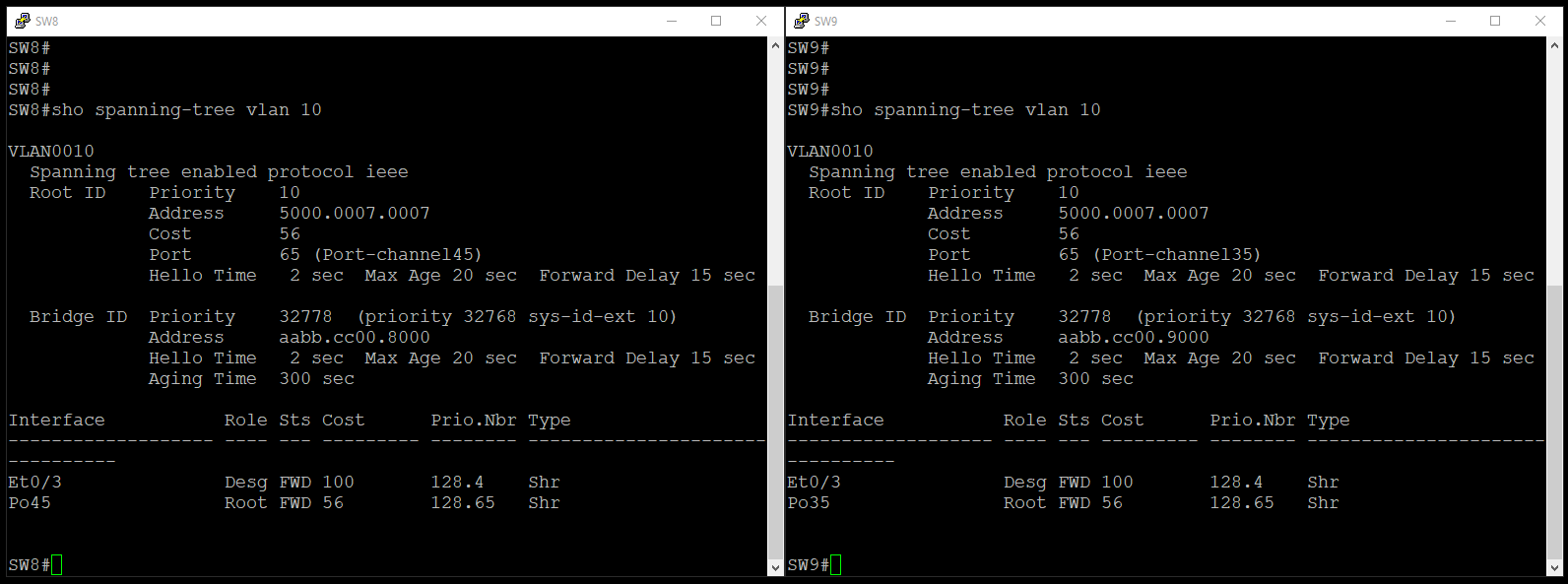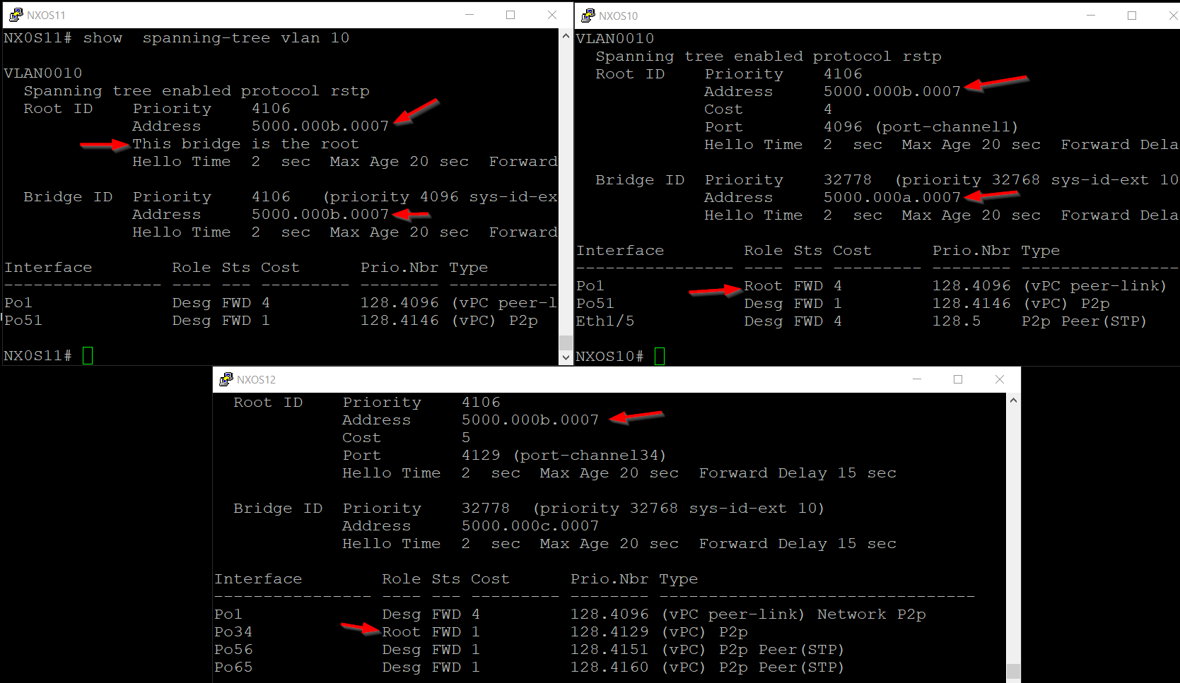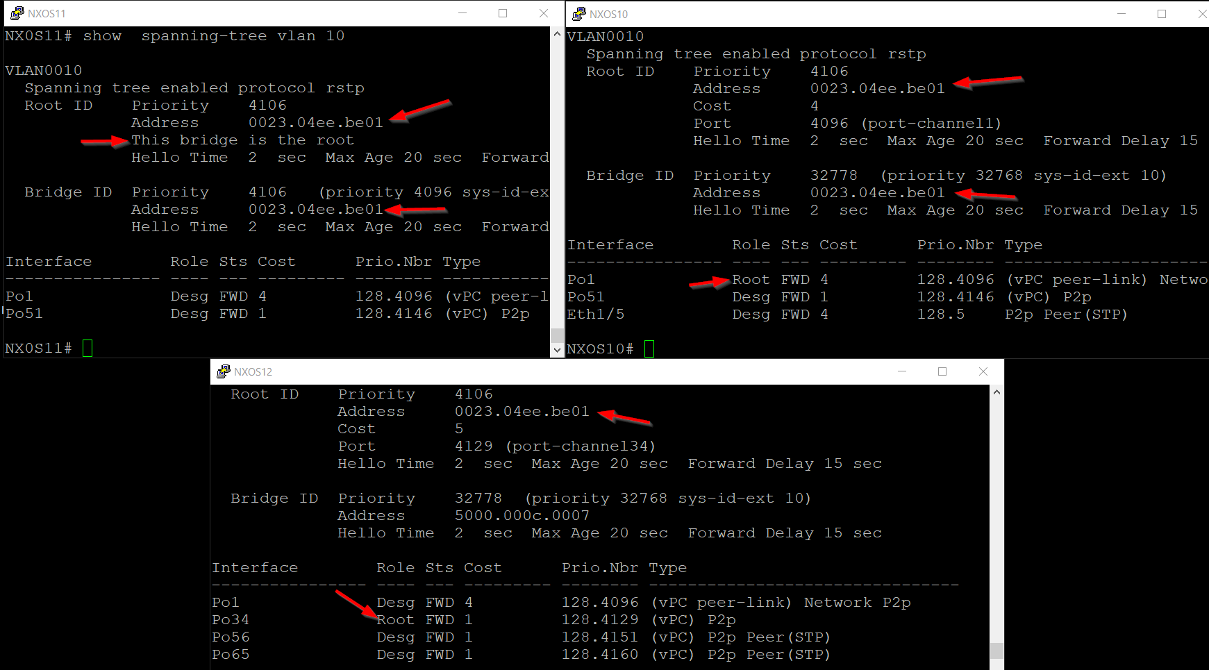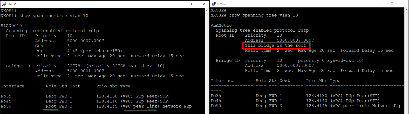 - Each NXOS10 and NXOS11 switch sends BPDUs with a root bridge identified by the virtual bridge ID.