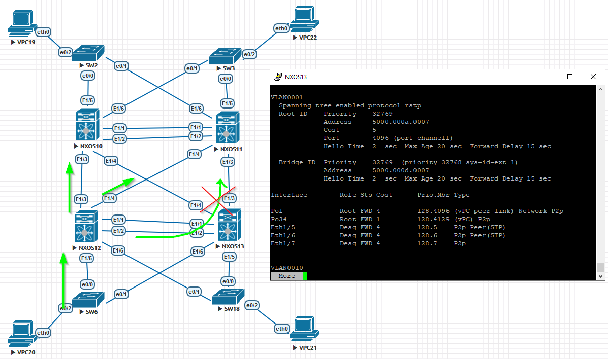 As a result NXOS13 will have two interfaces with Root role: Po1 (Peer Link) and Po34 (link to another vPC peers). In this case a Data Plane loop prevention mechanism is in use: the frame comes in on the Peer Link is not allowed to go out a member port.