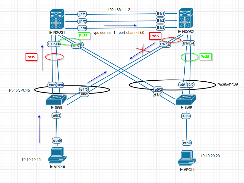 NXOS2 will not flood frames (received over vPC Peer Link) over Po45 while NXOS1 Po45 is up.