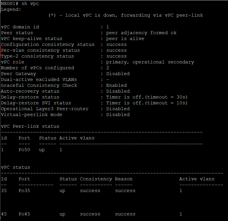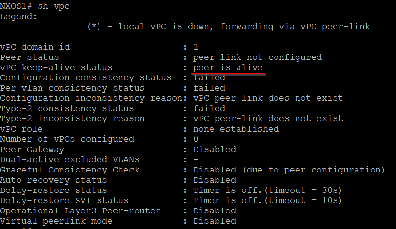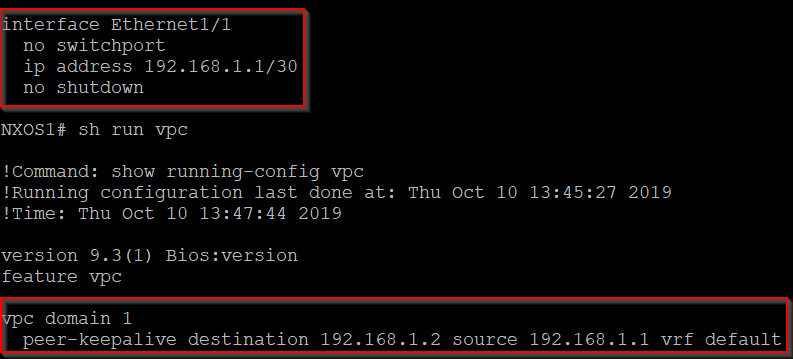 peer-keepalive destination 192.168.1.2 source 192.168.1.1 vrf VPC-PEER-KEEPALIVE