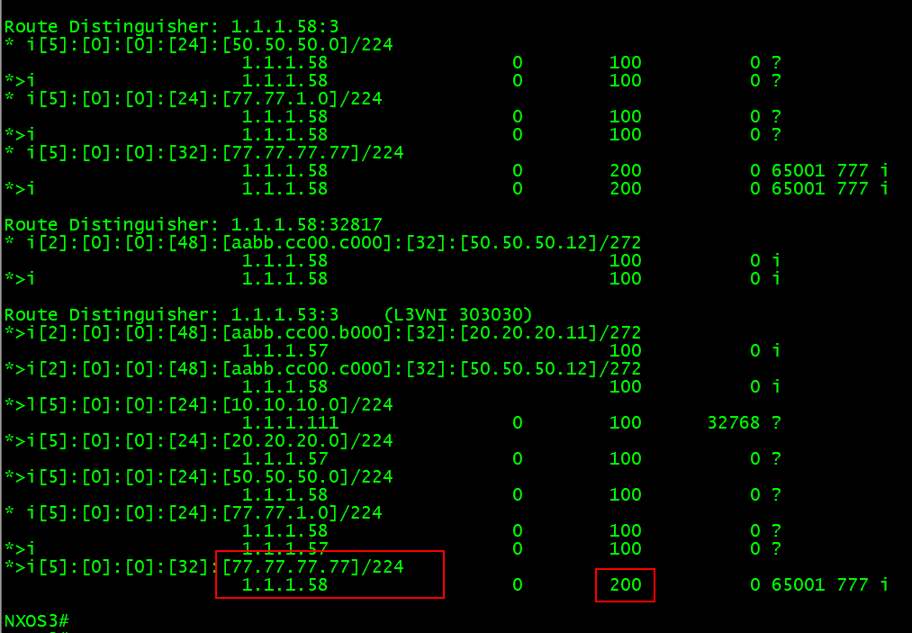 LP200 on NXOS8 (more preferred) and default LP100 on NXOS7. It will be advertised to the RR, RR will prefer NXOS8 and reflects to other Leafs (they will see only one possible exit point)