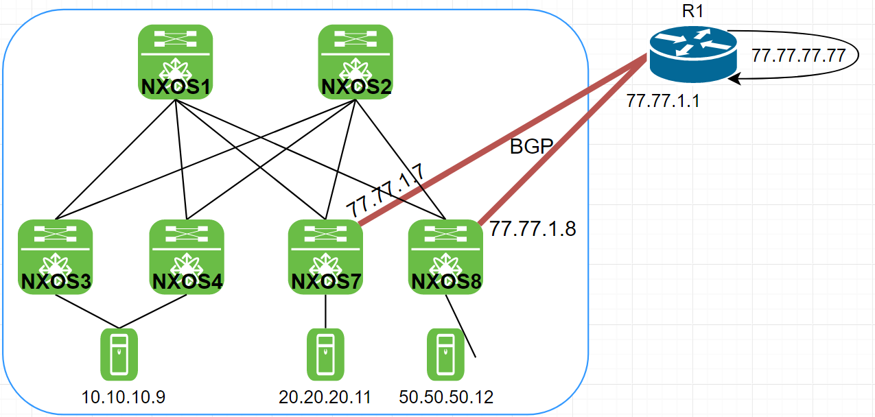 Traffic engineering: /32 more specific from NXOS7 and /24 from NXOS8, Will fail over if NXOS7 goes down