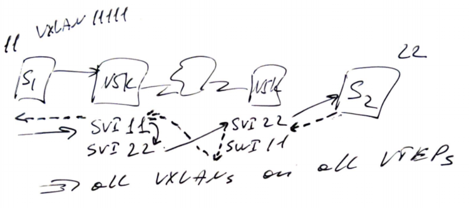 Cons: on the way back, traffic will be reversed => all VXLANs need to be configured on all VTEPs => increased ARP cache and CAM table sizes and control plane scaling issue => not very efficient.