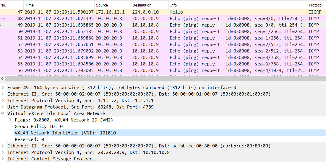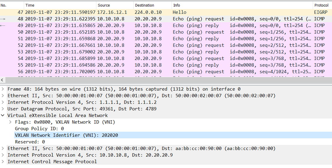 - Incoming Echo request from N5K1 is in VNI 202020