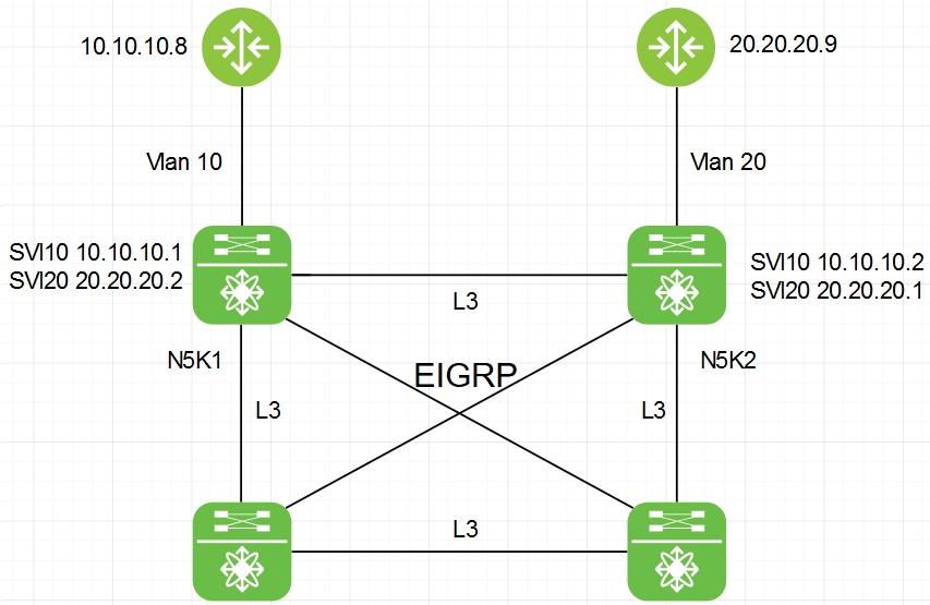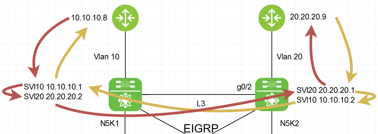 From R9 to R8 (orange): R9 ->20.20.20.1(N5K2 SVI20)->10.10.10.2(N5K2 SVI10)->10.10.10.2(N5K1 SVI10)->R8