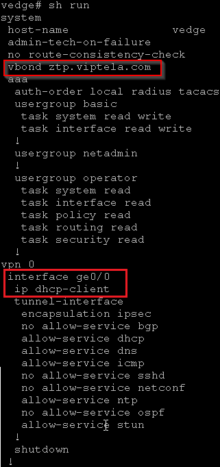 - system vbond ztp.viptela.com—Configures the initial vBond orchestrator to be the Viptela ZTP SaaS server.