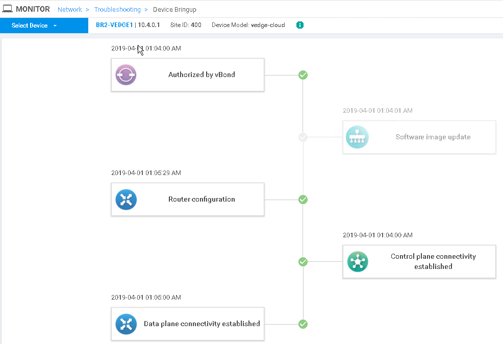 - Re-establishes a connection to the vManage NMS using its system IP address. The vManage NMS pushes the image got upgrade and the full configuration to the router