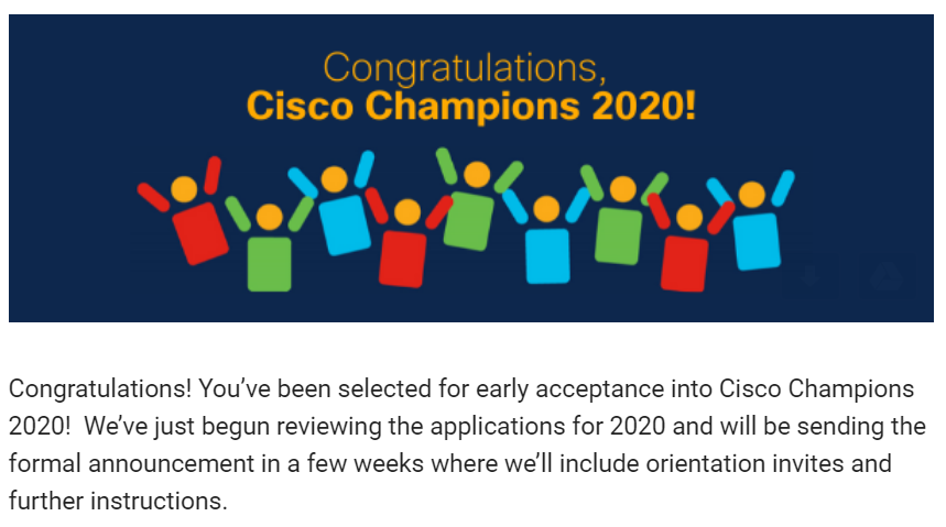 Thrilled to be selected as a CiscoChampion for the first time! Great way to start off 2020!💥